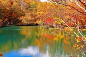 - 蔵王温泉スキー場のゲレンデ上部にある、周囲約350mの神秘的な沼です。沼底からの湧水によって枯れることがなく、エメラルドグリーンに輝く水面が特徴的です。周囲は豊かな自然に囲まれ、四季折々の風景が楽しめます。特に、木々の緑と沼のコントラストが美しく、トレッキングの途中に立ち寄りたい癒やしのフォトスポットです。