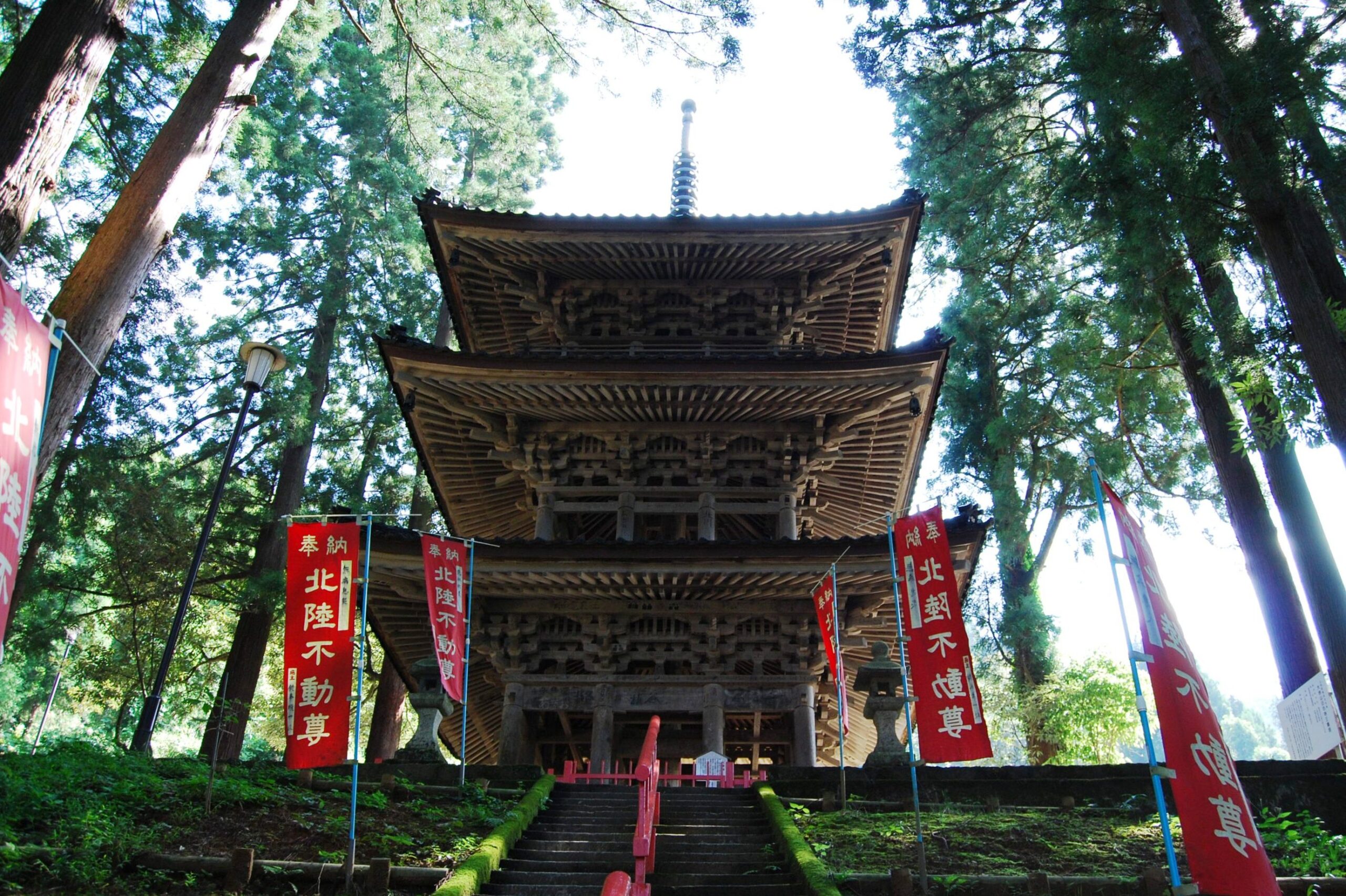富山県上市町にある真言密宗の寺院で、山岳信仰の霊場として知られます。境内の巨大な岩壁に刻まれた「不動明王像」は迫力満点。滝行の場としても知られ、夏にはそうめん流しも楽しめます。