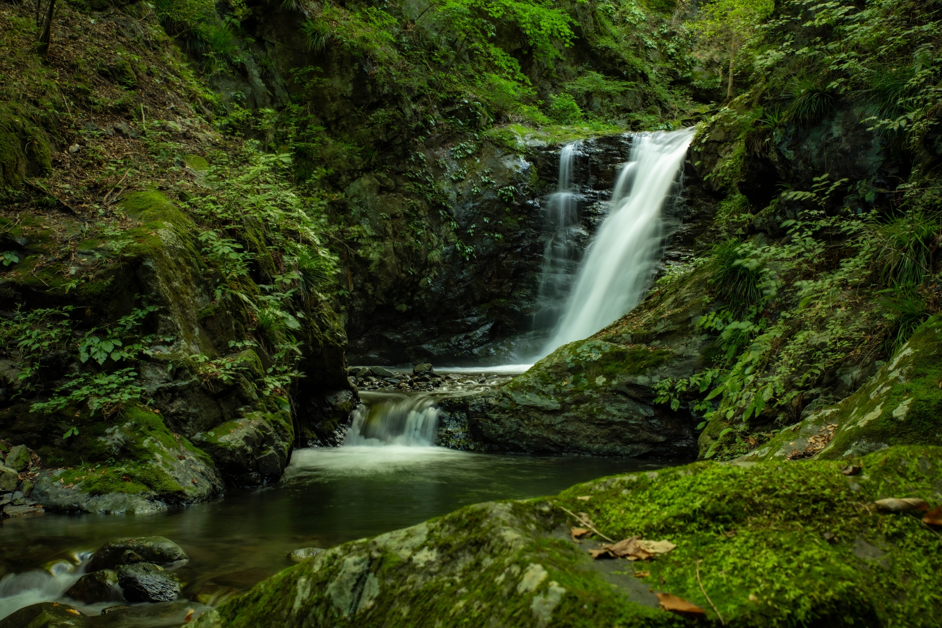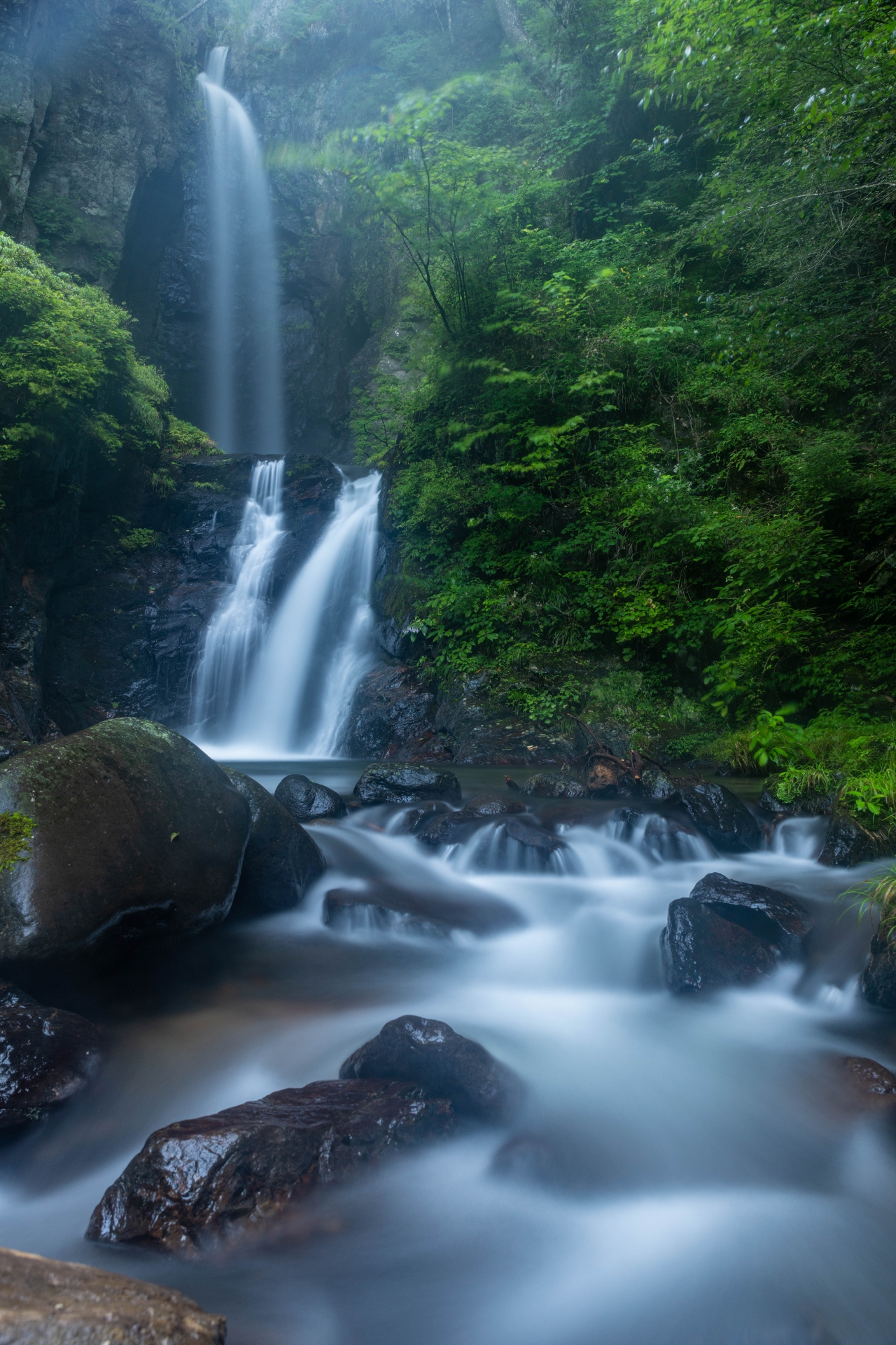 山梨県山梨市にある、西沢渓谷内にある美しい滝。その名の通り、7つの釜と5つの段からなる複雑な形状が特徴で、エメラルドグリーンの水が幻想的な景観を作り出します。