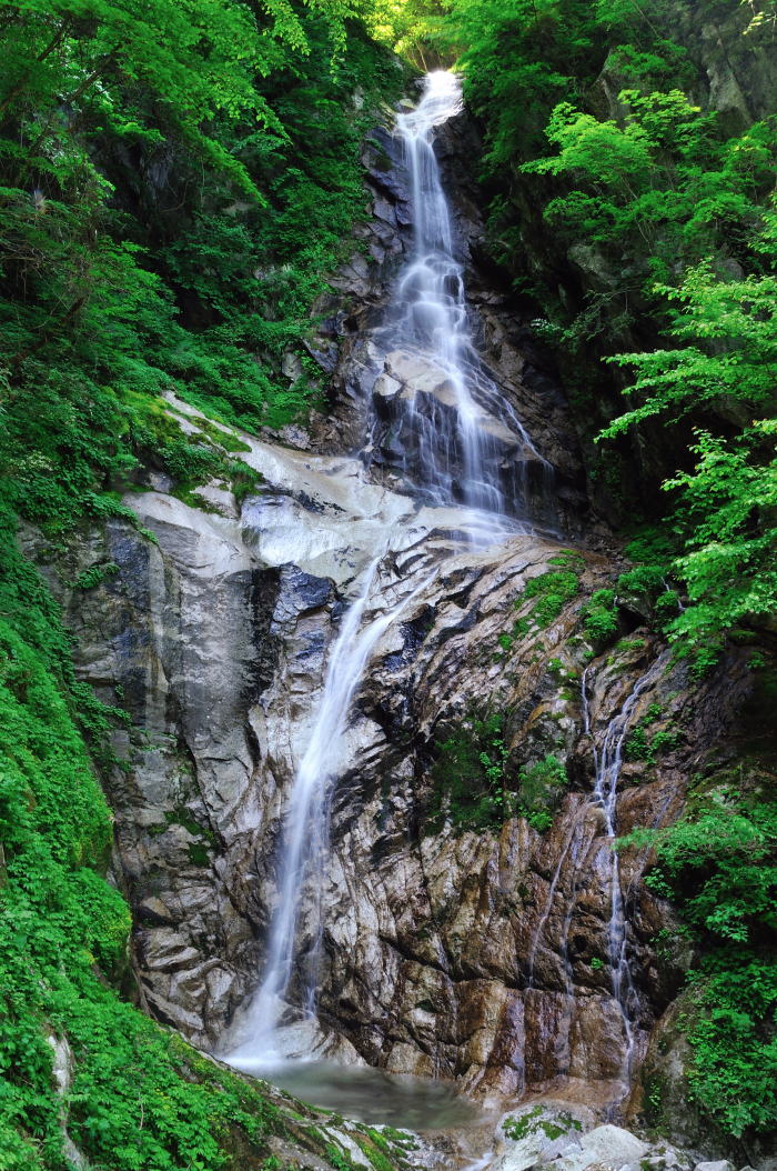 山梨県北杜市にある、尾白川渓谷にある滝の一つ。白い岩肌を流れ落ちる清らかな水が特徴で、周囲の自然と調和した美しい景観が魅力です。