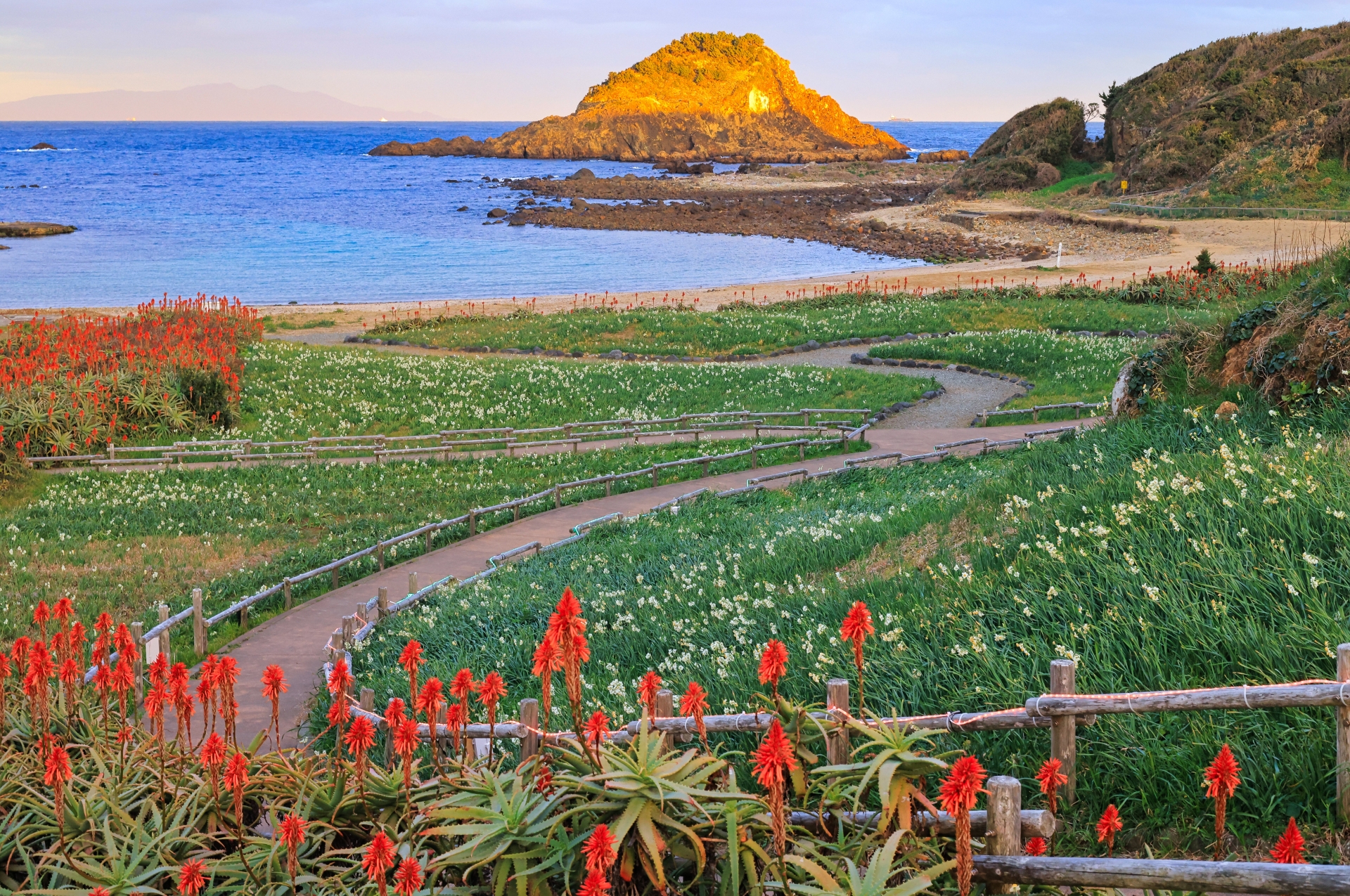 - 静岡県下田市の須崎半島先端に位置する岬。12月下旬から2月にかけて約300万本の野水仙が咲き誇ることで有名で、辺り一面が白い絨毯を敷き詰めたようになり、甘い香りに包まれます。青い海と空、そして白い灯台と水仙のコントラストが非常に美しく、人気のフォトスポットです。磯遊びができる海岸もあり、夏場以外も楽しめます。水仙まつりの期間中は特に賑わいますが、早朝は静かに散策できます。