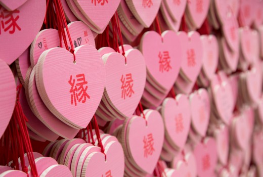 愛知県犬山市にある、犬山城の麓にある神社。特に、ピンクのハート型の絵馬が有名で、縁結びのパワースポットとして知られています。朱色の鳥居と、可愛らしい絵馬がフォトジェニック。