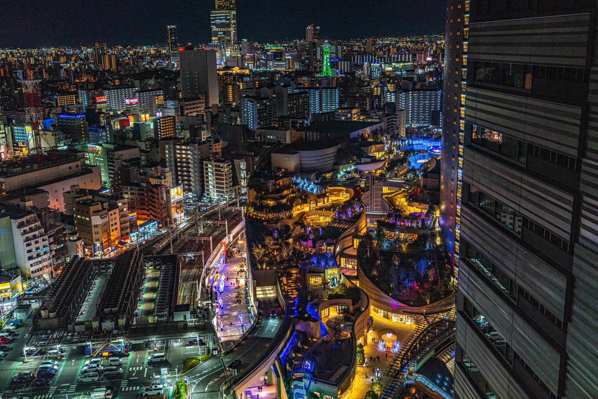 - 大阪市浪速区にある、屋上庭園が特徴的な複合商業施設。段丘状になった建物に沿って緑豊かな庭園が広がり、都会の中のオアシスのような空間です。モダンな建築デザインと、自然の緑が融合した風景は、都会的なポートレートや、建築写真を撮るのに最適です。特に夜間のライトアップは幻想的で、ロマンチックな雰囲気が漂います。
