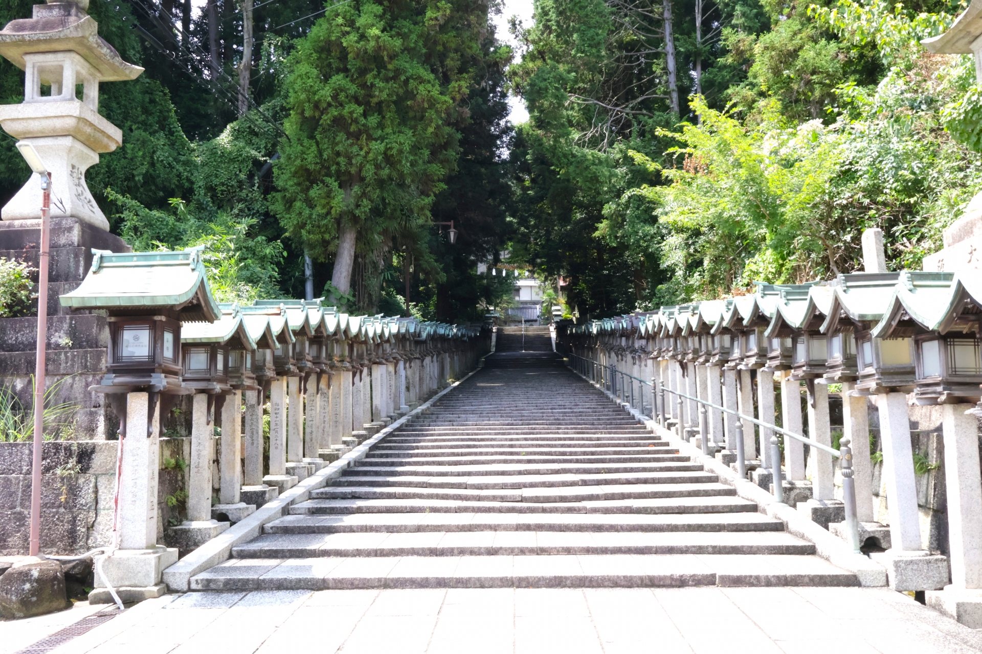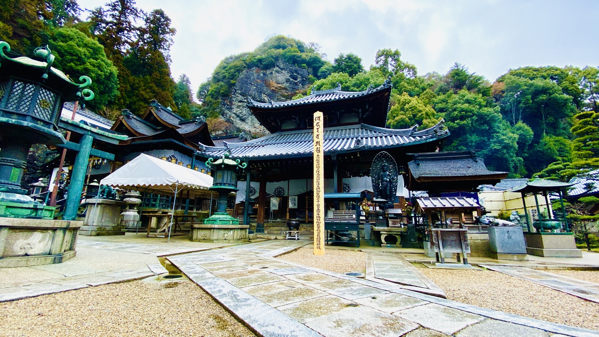 奈良県生駒市にある、生駒聖天として知られる真言律宗の寺院。急な石段の参道や、豪華な伽藍が、厳かで壮麗な雰囲気を醸し出しています。特に夜間はライトアップされ、幻想的な光景が広がります。山の中腹からの眺望も魅力です。