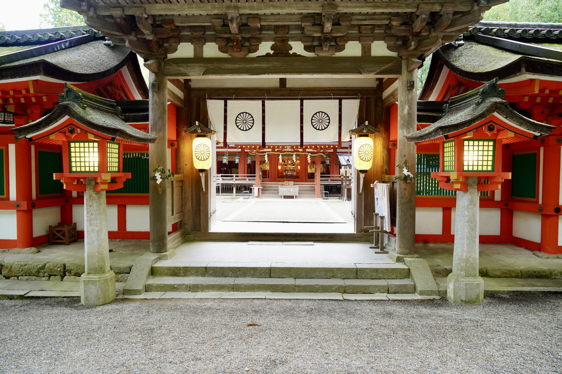 奈良県天理市にある、日本最古の神社の一つとされる神社。国宝の拝殿や、鶏が放し飼いにされている境内が特徴的です。厳かで神聖な雰囲気が漂う中で、日本の歴史と伝統を感じさせる写真が撮れます。