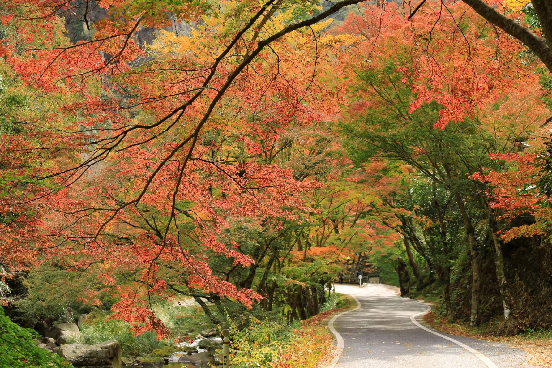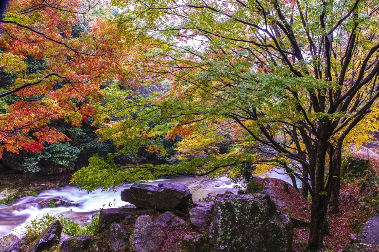 岡山県総社市にある、紅葉の名所として知られる渓谷。奇岩や巨岩と、清流が織りなす景観は、壮大でダイナミックな写真を作り出しています。特に、紅葉の季節は、鮮やかな色彩が加わり、美しい風景が広がります。
