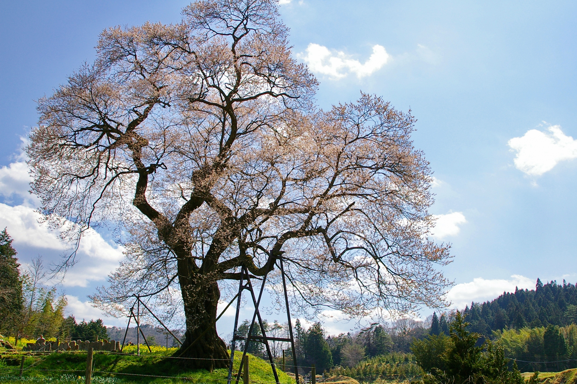 広島県庄原市にある、推定樹齢600年の巨大な一本桜。春には見事な花を咲かせ、その壮大な姿は圧巻です。力強い古木と、薄紅色の花のコントラストは、情緒豊かで美しい写真が撮れます。