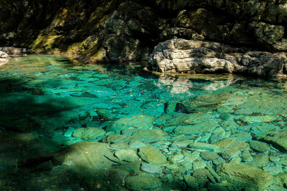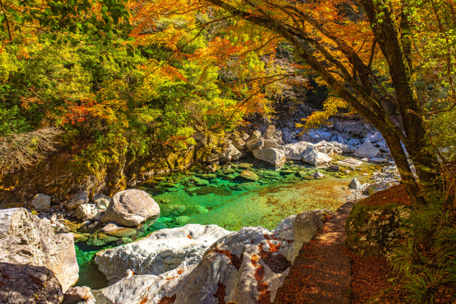 高知県吾川郡にある、仁淀川の支流、安居川の渓谷です。「仁淀ブルー」の神秘的な青さを最も美しく見られる場所の一つとして知られています。特に「水晶淵」や「飛龍の滝」などのスポットは、その透明度と青さが際立ちます。手つかずの自然が残る秘境で、幻想的な水の色彩を写真に収めることができます。