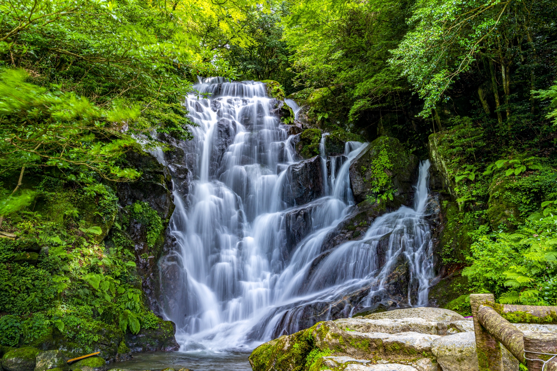 福岡県糸島市にある、落差約24mの美しい滝です。周囲は自然に囲まれ、夏には涼を求めて多くの人が訪れます。滝の近くには、そうめん流しやヤマメ釣りなどが楽しめる施設もあります。