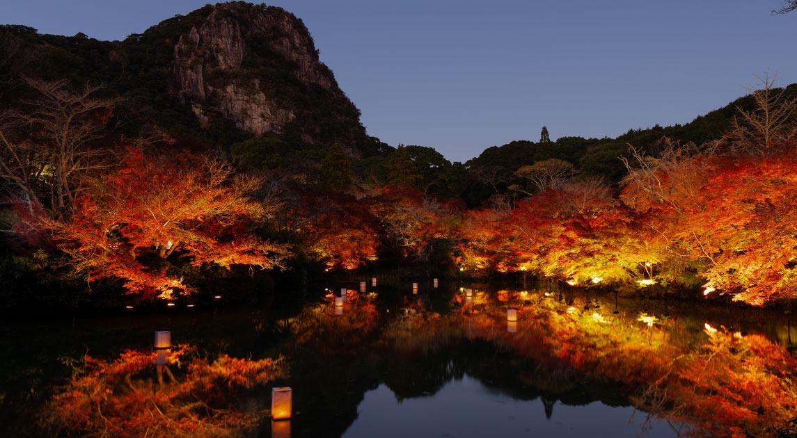 佐賀県武雄市にある、御船山の麓に広がる広大な庭園です。春のつつじ、秋の紅葉など、四季折々の花や景色を楽しめます。特に夜のライトアップは幻想的で、多くの観光客を魅了します。