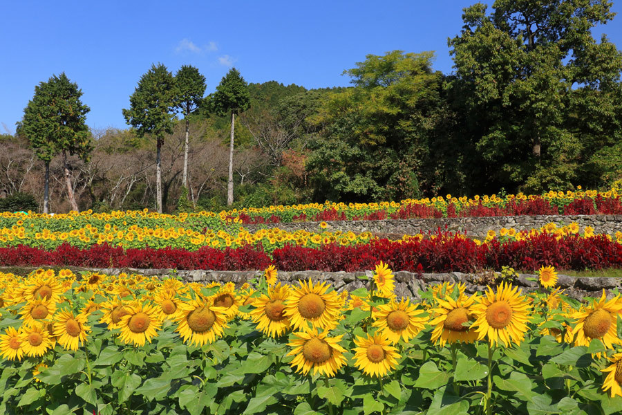 佐賀県みやき町にある、夏になると広大な敷地一面にひまわりが咲き誇る畑です。約50万本のひまわりが一斉に咲く様子は圧巻で、黄色い花の絨毯が青い空と美しいコントラストを作り出します。