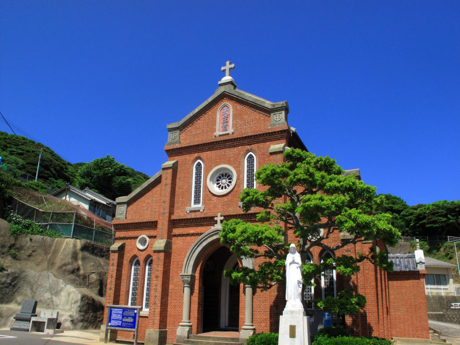 長崎県五島市にある奈留島にある、煉瓦造りの美しいカトリック教会です。国の重要文化財に指定されており、五島列島のキリシタン文化を伝える貴重な建造物です。