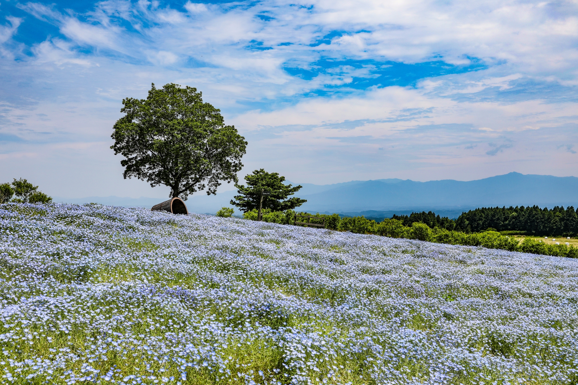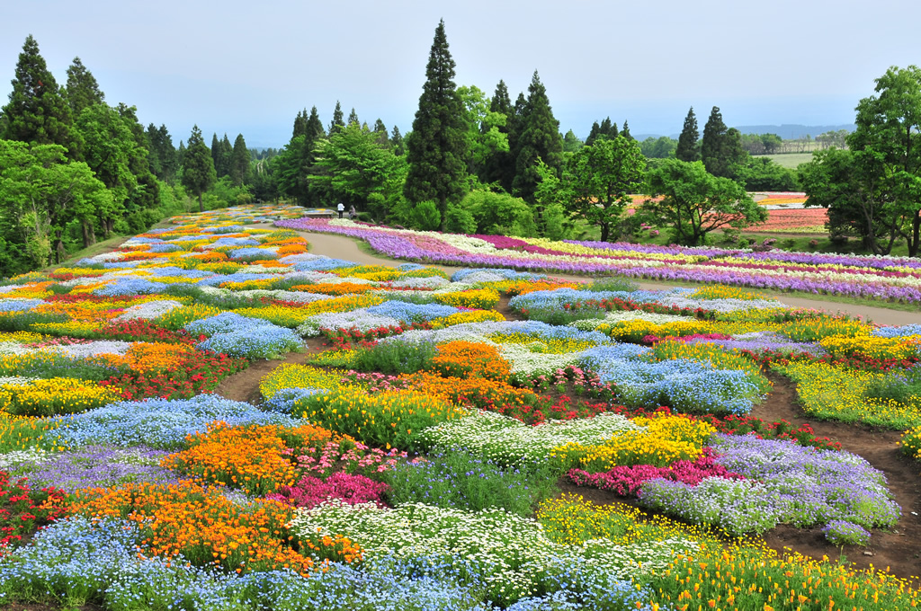 九重連山の雄大な自然に抱かれた、四季折々の花々が咲き誇る広大な公園。春のチューリップから秋のコスモスまで、約500種300万本の花が咲き乱れます。特に、広大な敷地を埋め尽くす色とりどりの花の絨毯と、遠景に見える九重連山のコントラストは圧巻の美しさです。花畑の中の小道や、可愛らしい小屋などを活かして、メルヘンチックで華やかな写真を撮ることができます。花の季節には多くの観光客とカメラマンで賑わいます。
