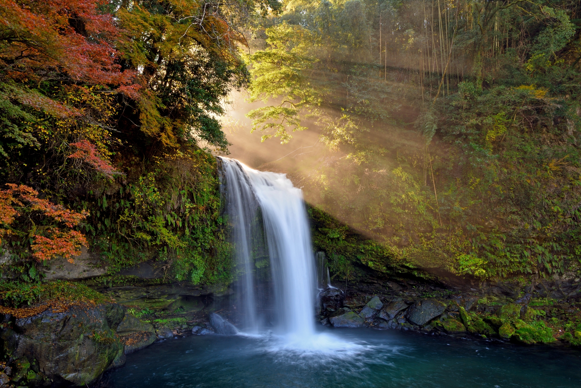 - 大分県と福岡県の県境に近い玖珠町にある、二段に流れ落ちる美しい滝。滝の裏側にも回れる「裏見の滝」としても知られており、滝を内側から見上げる珍しい体験ができます。水のカーテン越しに見る景色は、幻想的で神秘的な写真が撮れます。滝の近くには、龍が住んでいたという伝説も残り、パワースポットとしても人気です。新緑や紅葉の季節は、周囲の自然の色合いが滝の美しさを際立たせます。