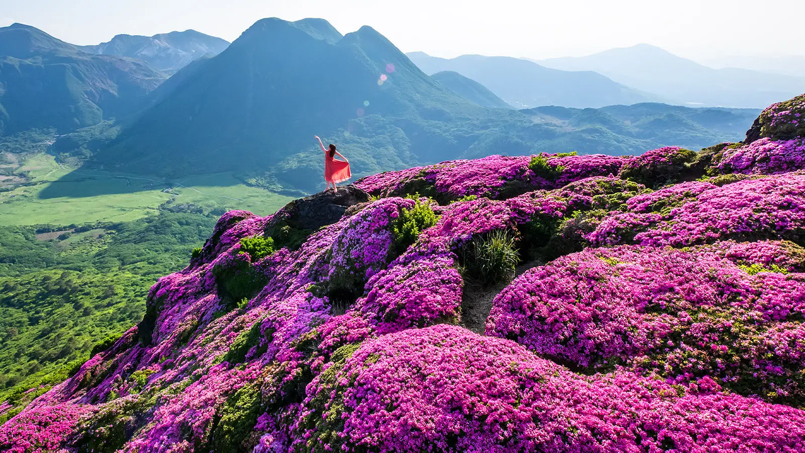 - 九重連山の一つで、ミヤマキリシマの群生地として知られる山。特に、5月下旬から6月上旬にかけて、山肌一面がピンク色に染まるミヤマキリシマの群落は、息をのむ美しさです。壮大な山岳風景と、可憐な花のコントラストを活かした、ダイナミックで華やかな写真を撮ることができます。