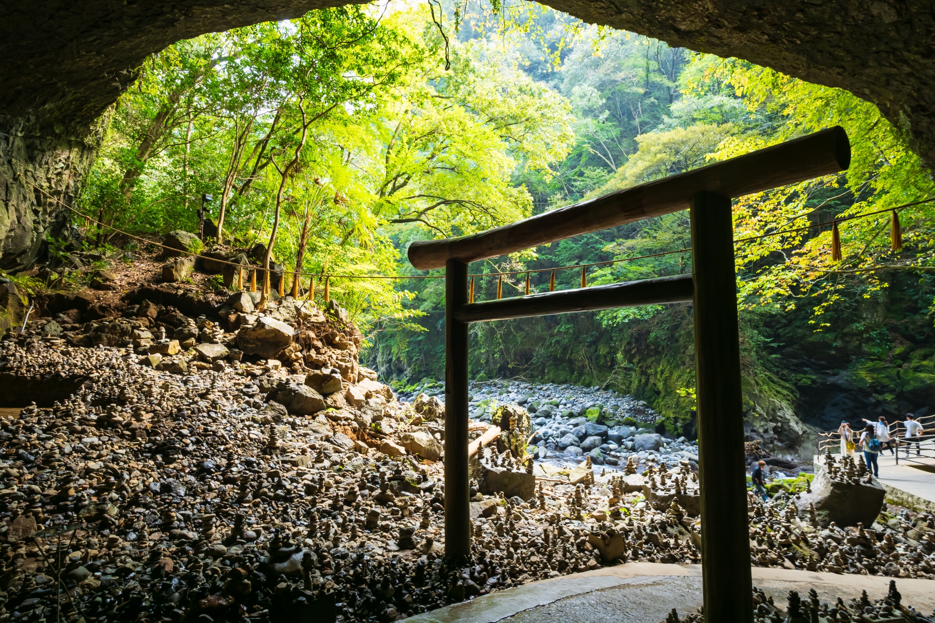 - 高千穂峡の近くにある、天照大神が隠れたとされる「天岩戸」の岩戸隠れの神話に登場する洞窟。洞窟の中には、無数の石が積み上げられており、神秘的で厳かな雰囲気が漂います。石積みの光景と、洞窟の暗がりを活かした、幻想的な写真を撮ることができます。