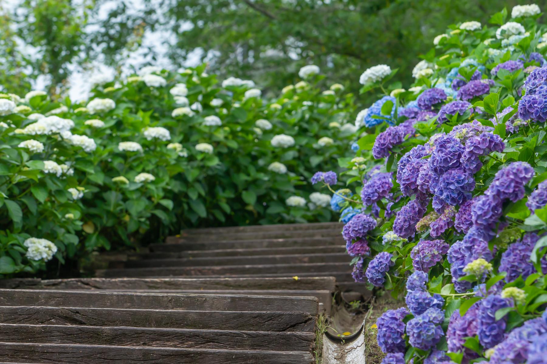 宮崎県都城市にある、梅雨の時期にあじさいが咲き乱れる公園。色とりどりのあじさいと、緑のコントラストが美しいです。雨の日でも情緒ある写真を撮ることができ、日本の梅雨の美しさを表現できます。