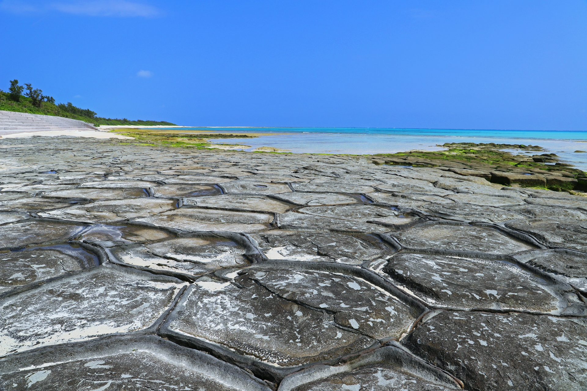 - 久米島の隣、奥武島にある奇岩群。五角形や六角形の亀の甲羅のような岩が1,000個以上も並び、幾何学的な美しさを見せています。干潮時に現れるこの広大な岩畳は、自然の造形美を写すのに最適。ローアングルで岩の並びを強調したり、水溜まりに映る空を狙ったりと、アートのような抽象的な一枚も撮影できます。