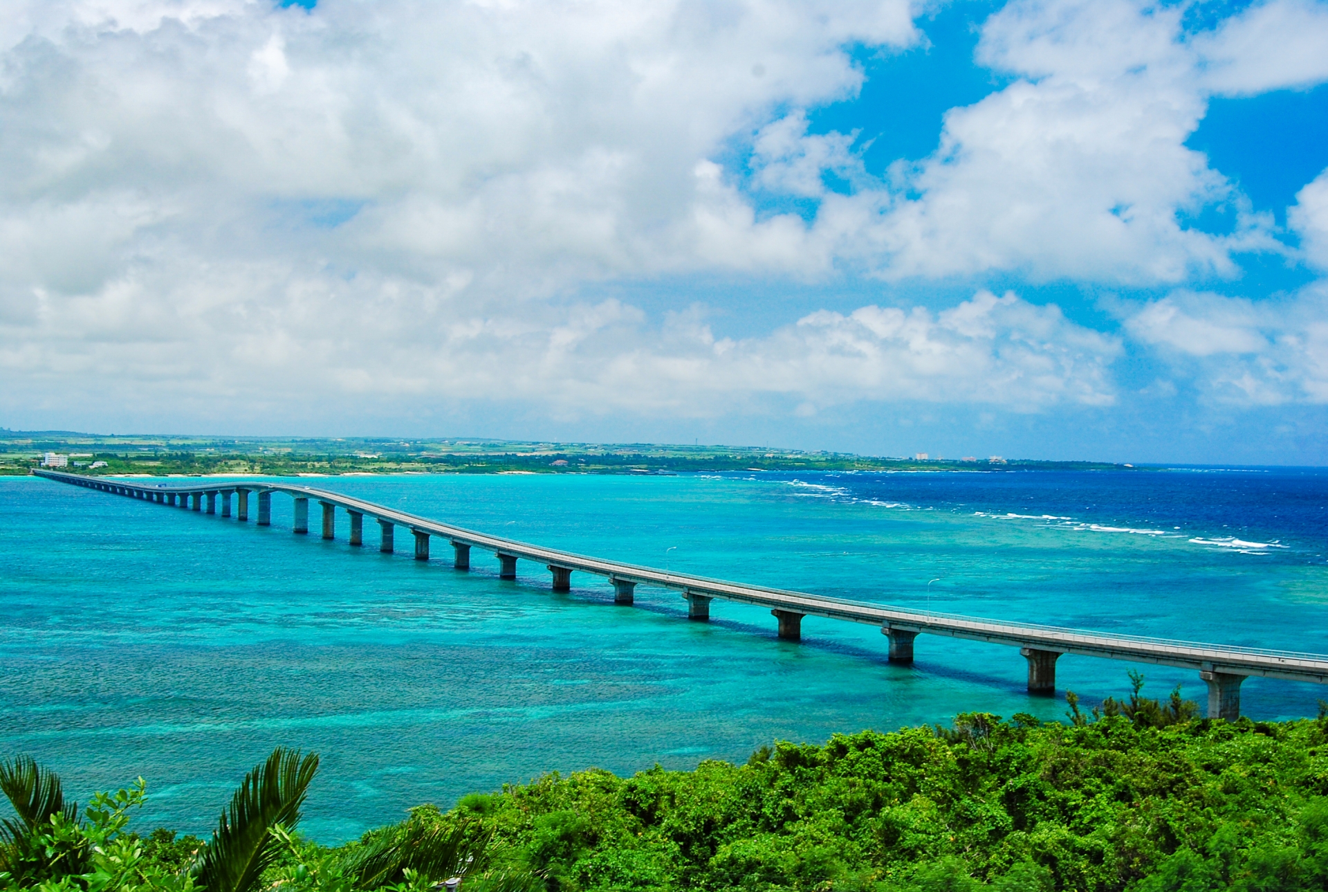 宮古島と来間島を結ぶ橋。橋の上からの海の景色が絶景で、透明度の高い海が広がります。