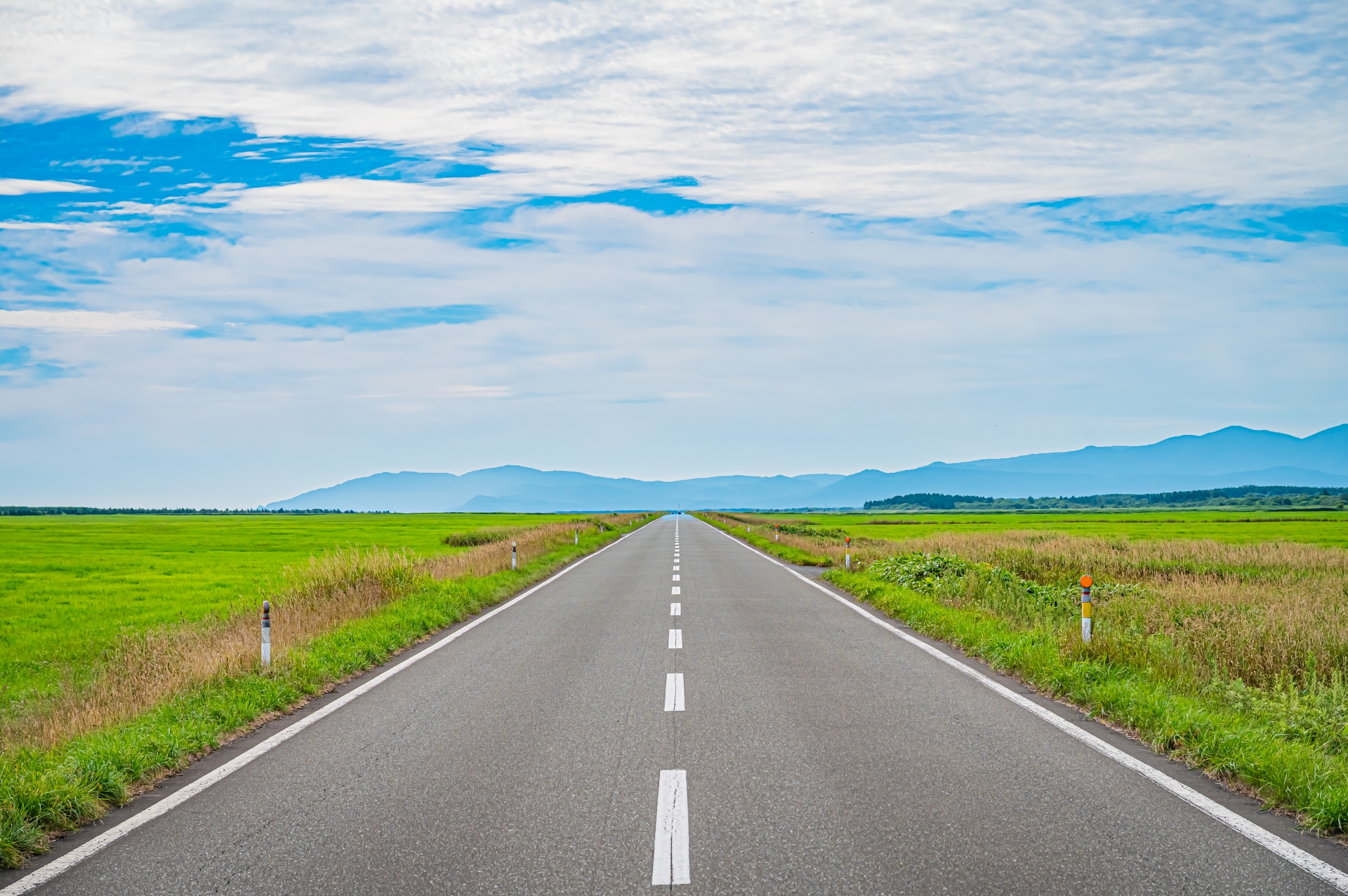 - 北海道宗谷郡猿払村に位置する、どこまでも続く直線道路。両側に広がる雄大な牧草地帯と、遮るもののない青空、そして地平線まで伸びる道の光景は、北海道らしい開放感あふれる一枚を撮るのに最適です。特に夏季は緑の絨毯のような牧草地が広がり、道の真ん中に立って非日常的なロードトリップの雰囲気を演出できます。映画のワンシーンのような、ダイナミックで爽快な写真を残したい方に最高のフォトスポットです。